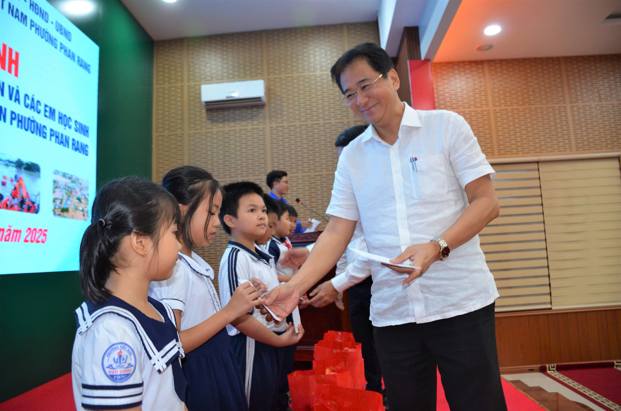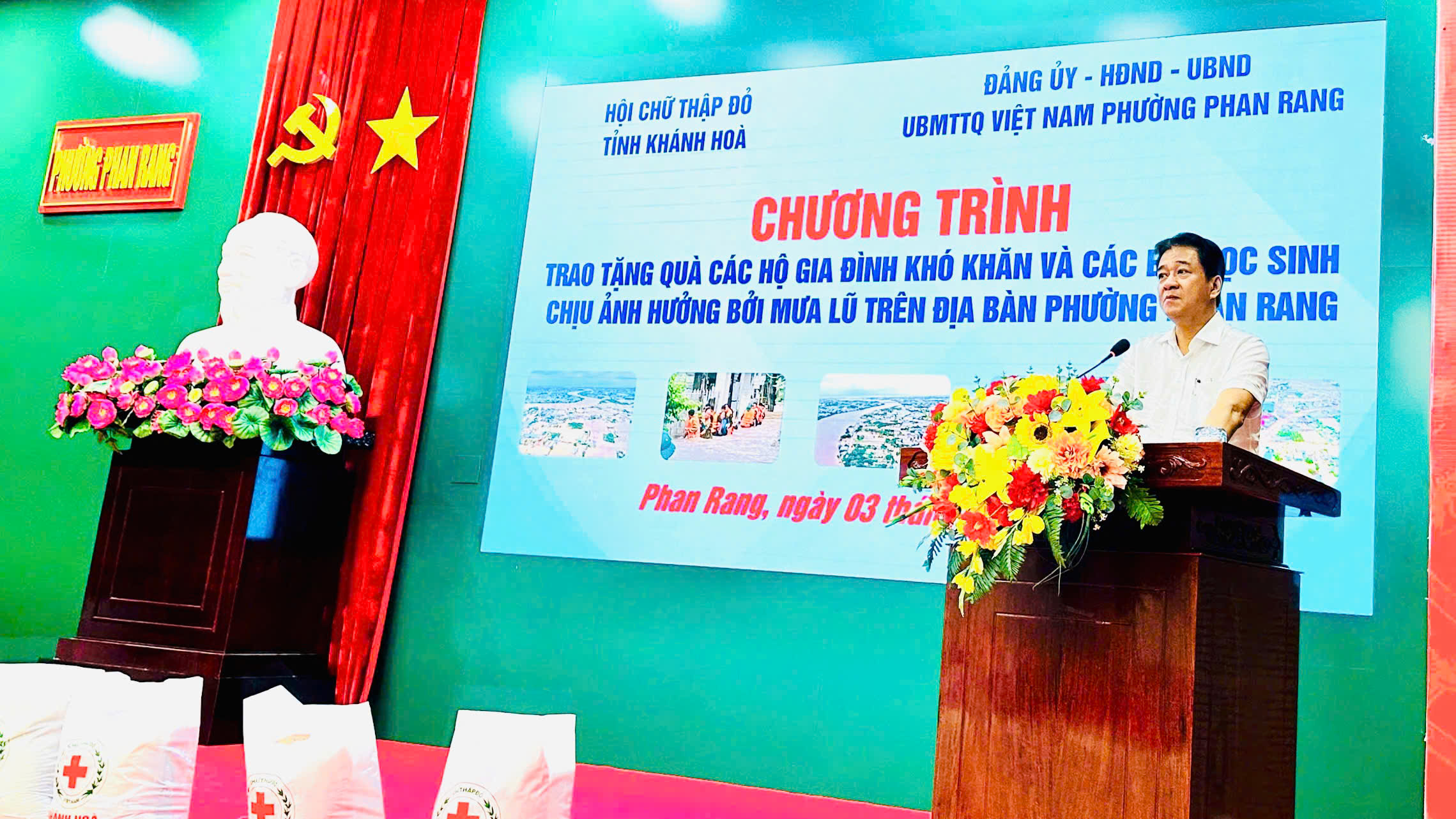 Phát biểu tại buổi lễ, ông Nguyễn Long Biên, Ủy viên Ban Thường vụ Tỉnh ủy, Phó Chủ tịch Thường trực UBND tỉnh Khánh Hòa gửi lời chia sẻ sâu sắc đến những mất mát, khó khăn mà người dân phường Phan Rang đang phải gánh chịu. Ông động viên bà con cố gắng vượt qua giai đoạn khó khăn để sớm ổn định cuộc sống, đồng thời chỉ đạo chính quyền địa phương khẩn trương thực hiện các chính sách hỗ trợ của Nhà nước và đẩy mạnh công tác khắc phục hậu quả, khôi phục sản xuất. Đồng thời, ông biểu dương nỗ lực của Hội Chữ thập đỏ tỉnh Khánh Hòa và gửi lời cảm ơn chân thành đến các doanh nghiệp, tổ chức, cá nhân đã chung tay góp sức giúp đỡ người dân vùng lũ tỉnh Khánh Hòa nói chung và phường Phan Rang nói riêng.