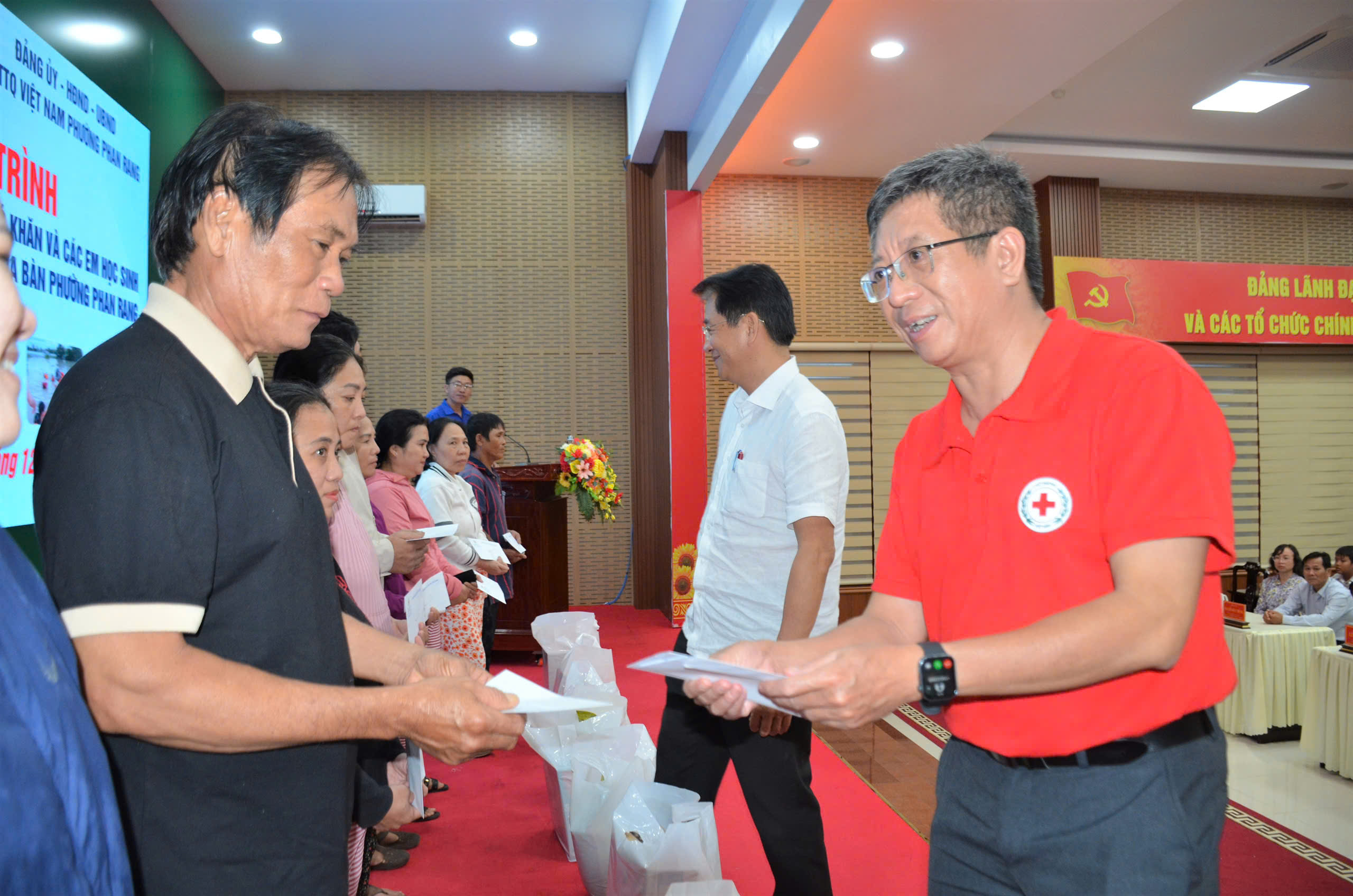 Chiều ngày 3-12, nhân dịp ông Nguyễn Long Biên – Ủy viên Ban Thường vụ Tỉnh ủy, Phó Chủ tịch Thường trực UBND tỉnh Khánh Hòa đến thăm động viên người dân phường Phan Rang chịu ảnh hưởng của thiên tai, Hội Chữ thập đỏ tỉnh Khánh Hòa phối hợp với Đảng ủy – HĐND – UBND – Ủy ban Mặt trận Tổ quốc Việt Nam phường Phan Rang tổ chức chương trình trao tặng 200 suất quà cho các hộ gia đình khó khăn và học sinh bị ảnh hưởng nặng nề bởi đợt mưa lũ vừa qua.