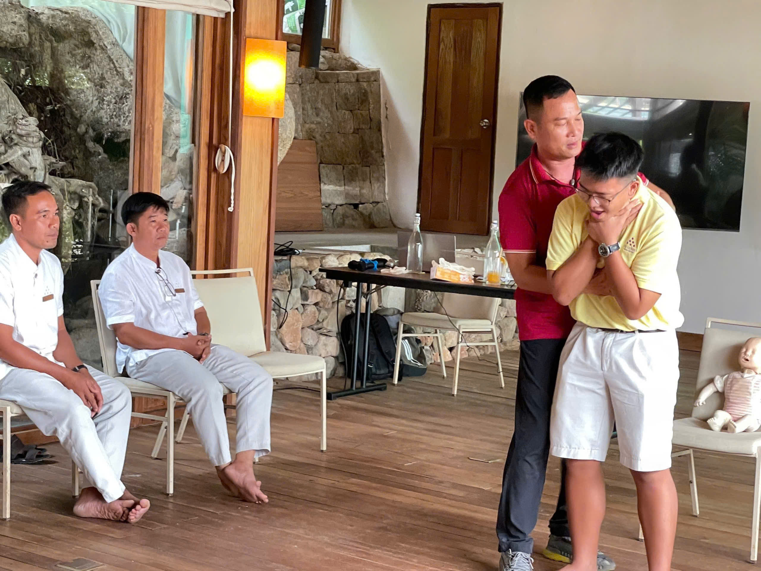 Tại lớp đào tạo, các tập huấn viên trang bị cho học viên những kiến thức, nguyên tắc cơ bản về sơ cấp cứu. Đồng thời, thực hành trên mô hình về các kỹ năng hồi sinh tim phổi; sơ cứu các vết thương phần mềm, băng bó vết thương; sơ cứu điện giật; chảy máu; dị vật đường thở; đuối nước; gãy xương; các phương pháp vận chuyển nạn nhân an toàn… Đây là lớp đào tạo sơ cấp cứu thứ 10 của Trung tâm đào tạo huấn luyện Sơ cấp cứu cộng đồng cho Khu nghỉ mát Six Senses Ninh Vân Bay - Công ty Cổ phần du lịch Hồng Hải.